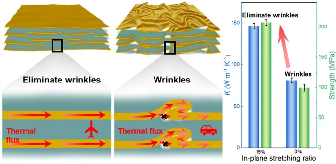 1. 通过面内拉伸的约束干燥策略制备了消除石墨烯纳米片褶皱的高导热复合膜。