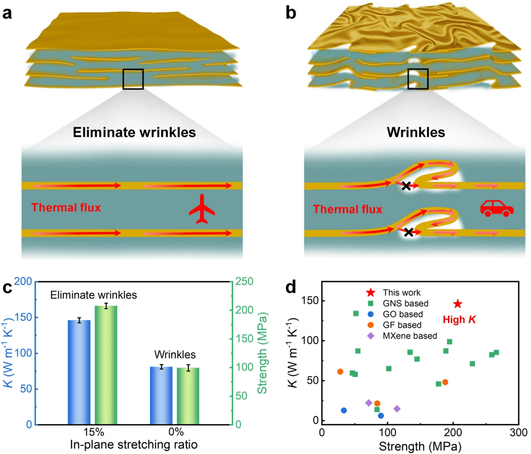 图1. 消除纳米片褶皱的GNS/ANF复合膜的热导率和力学性能。(a, b)消除纳米片褶皱和具有纳米片褶皱的复合膜的热传递示意图和(c)热导率与拉伸强度对比图;(d)复合膜的热导率和拉伸强度与以往文献的对比。
