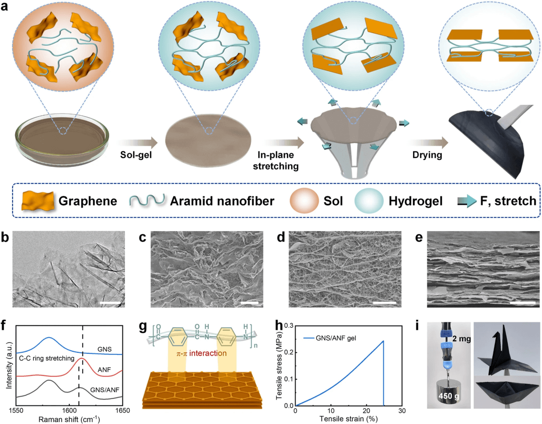 图2. 面内拉伸法制备消除纳米片褶皱的GNS/ANF薄膜。(a)消除纳米片褶皱的GNS/ANF复合膜的制备示意图;(b)GNS的TEM图像,(c)自然干燥的GNS/ANF复合气凝胶的SEM图像;(d, e)约束干燥的GNS/ANF复合气凝胶和薄膜的SEM图像;(f, g)GNS、ANF、GNS/ANF复合膜的拉曼光谱及π-π相互作用示意图;(h)GNS/ANF复合水凝胶的应力-应变曲线;(i)复合膜可以提起重物并折叠成折纸鹤和船。