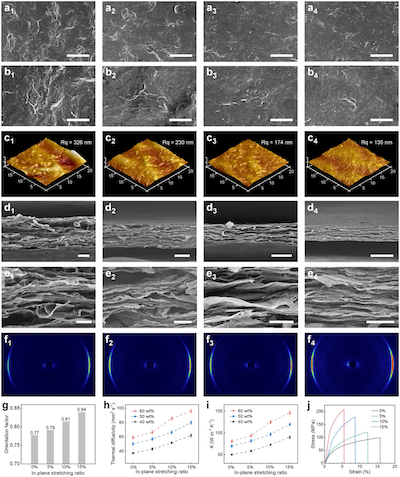 图3. 复合膜的褶皱调控和导热性能的提高。(a-c)不同拉伸比的复合膜的表面SEM图像和AFM图像;(d-f)不同拉伸比的复合膜的截面SEM图像和WAXS图;(g)取向因子;(h, i)不同拉伸比的复合膜的热扩散系数和热导率;(j)不同拉伸比的GNS/ANF-60 wt%薄膜的拉伸应力-应变曲线。