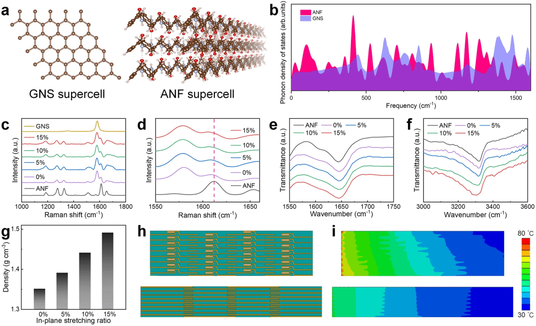 图4. 通过面内拉伸消除纳米片褶皱来提高GNS/ANF复合膜热导率的机理。(a) GNS与ANF模型;(b) ANF与GNS的声子态密度谱;(c-f)不同拉伸比的ANF膜、GNS膜和GNS/ANF复合膜的拉曼光谱和红外光谱;(g)不同拉伸比的GNS/ANF复合膜的密度;(h, i)有限元建模和温度分布。