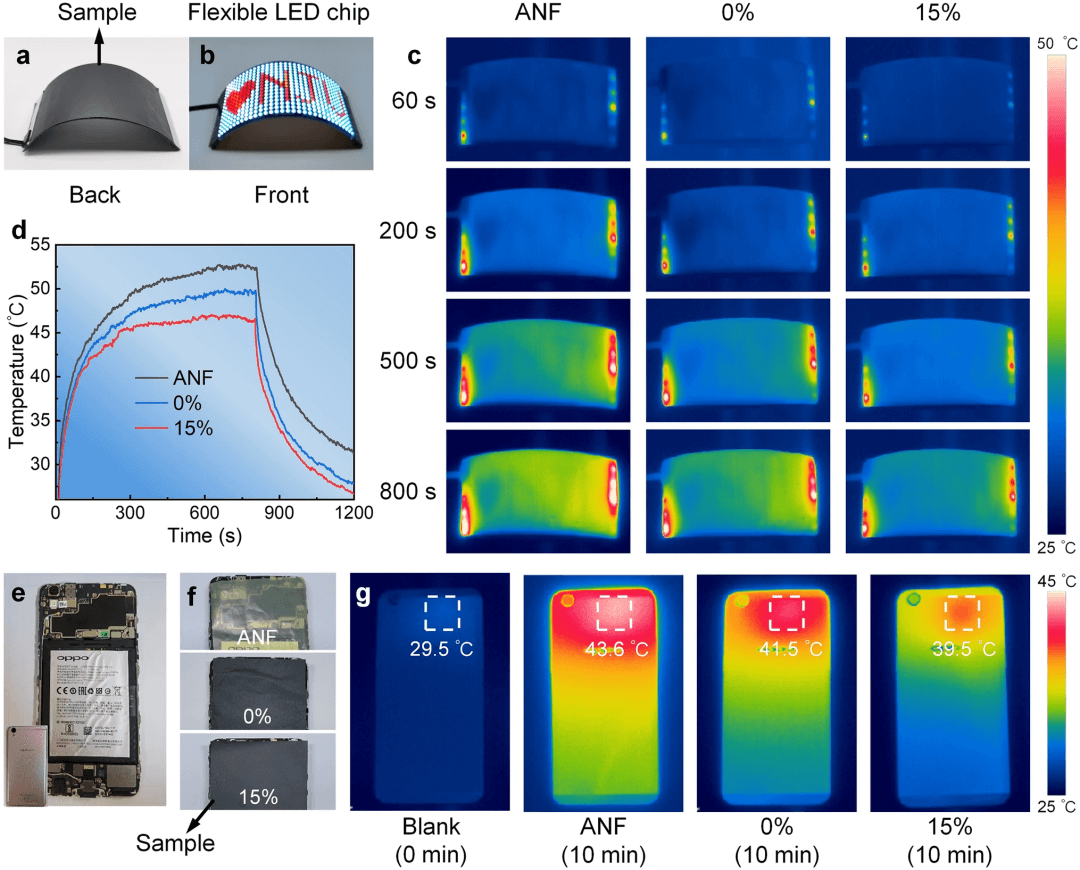 图 5. 消除纳米片褶皱的GNS/ANF复合膜的热管理演示。(a, b) GNS/ANF复合膜集成在柔性LED芯片背面;(c)红外热图像;(d)柔性LED屏幕的表面最高温度随工作时间的变化曲线;(e, f)GNS/ANF复合薄膜集成到智能手机中;(g)智能手机在不同工况下的热红外图像。