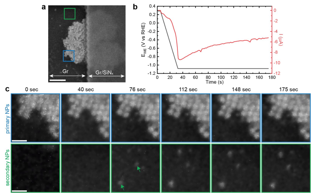 要点2. Operando扫描电子显微镜研究清楚地证明了空间分辨率的提高,但揭示了电子束和施加电势的协同效应,这限制了石墨烯基电化学芯片的稳定时间窗。通过优化操作条件,作者实现了在CO2电位为-1.1 V时对Cu纳米立方体降解的原位监测。