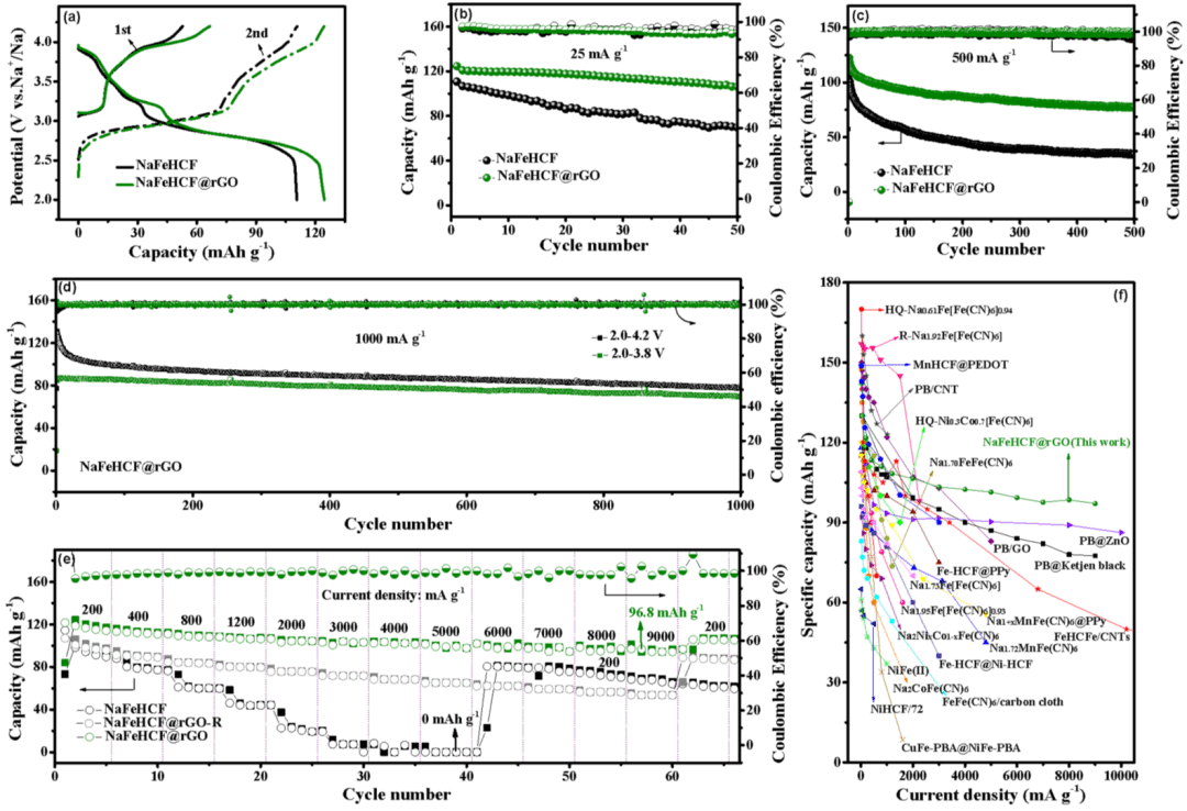 图5. NaFeHCF和NaFeHCF@rGO的电化学性能:(a)在25 mA g-1的电流密度下的充放电曲线。(b) 在25 mA g-1和(c)500 mA g-1以及(d)1000 mA g-1的电流密度下的循环性能。(e) 电流密度范围为2 C(200 mA g-1)到90 C(9000 mA g-1)时的倍率性能。(f) NaFeHCF@rGO与先前报道的NIBs中PBAs正极的倍率性能的对比图。
