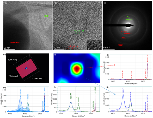 图3. NaFeHCF@rGO的(a,b)HRTEM和(c)SAED图像. NaFeHCF@rGO样品的(d)宏观三维图像和(e)在该区域中收集的所有拉曼光谱。(f) 拉曼成像图谱以及(g)绿色、(h)红色和(i)蓝色区域的代表性拉曼光谱。
