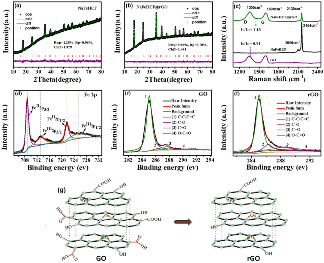 图4. 所制备的NaFeHCF和NaFeHCF@rGO样品的结构表征:(a,b)精修的XRD图谱。(c) 拉曼光谱。(d) NaFeHCF@rGO的Fe 2p XPS光谱。(e)GO和(f)NaFeHCF@rGO的C1s光谱。(g)GO转换为rGO的示意图。