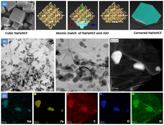 图2. NaFeHCF和NaFeHCF@rGO的形貌特征.(a)立方和切角状NaFeHCF的形貌和结构示意图。NaFeHCF@rGO的(b)TEM图像和(c)EDX图像。