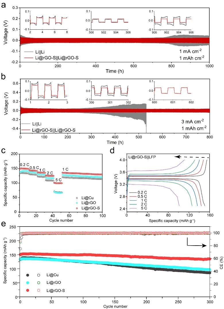 在弹性可压缩的基底作用下,无枝晶的锂金属负极和电解液形成的SEI保持稳定,锂金属和电解液间的副反应显著减少。因此,以rGO-S为电极的锂金属电池具有更高的库伦效率和更好的循环稳定性,在1 mA cm-2的电流密度和1 mAh cm-2面容量的半电池循环测试中稳定循环300圈,平均库伦效率为98.4%。相比传统电极,在循环过程中所需的过电势更小,电池的内部阻抗也更小。基于rGO-S电极的锂金属对称电池,在3 mA cm-2的电流密度下实现了1200次稳定循环。以磷酸铁锂为正极的全电池中实现了极佳的倍率性能和循环稳定性,在5C的高倍率下实现了100 mAh g-1的容量,在1C条件下稳定循环300圈后可以维持90%以上的容量。