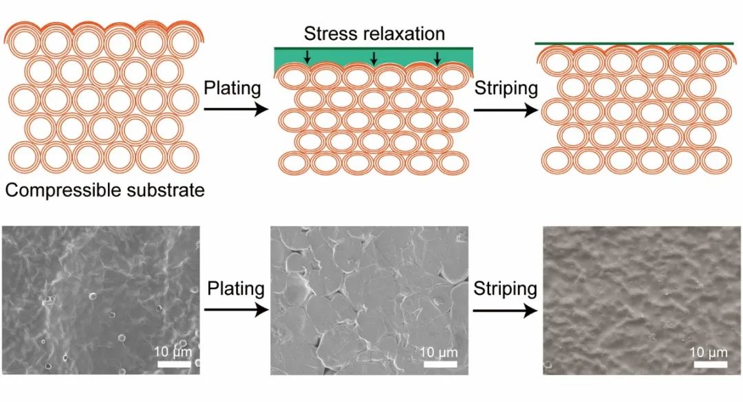 图1:可压缩的弹性基底实现无枝晶锂沉积的原理及效果图。