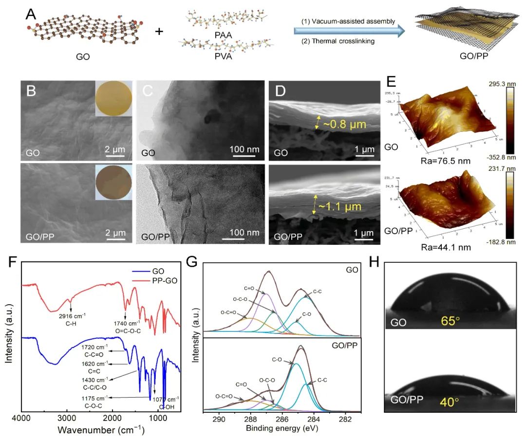 工业高盐废水的处理和循环利用是环境可持续性发展所面临的关键挑战。为了实现上述目标,反渗透(RO)技术因其低能耗、高效率和环保特性等优点,广泛应用于高盐水处理。然而,RO技术在处理超出其工作压力的浓盐水或污水中的非极性或低分子量挥发性有机物方面存在一定的局限性。膜蒸馏(MD)是一种热驱动的脱盐过程,热侧水在疏水膜表面蒸发并穿透疏水膜孔后在冷测冷凝,而非挥发性有机和无机物质则被截留在热侧进水中。传统的疏水MD膜由于其大孔结构无法实现对挥发性物质的截留,其在处理复杂高盐废水时面临着重大挑战。因此,开发具有足够大的纳米通道足以使水分子自由透过,同时能够截留住挥发性物质和水合离子对于复杂高盐废水处理具有重要意义。本研究成功开发了一种使用氧化石墨烯(GO)和聚乙烯醇和聚丙烯酸(GO/PP)简单组装并交联的多纳米通道聚合物插层GO膜,用于膜蒸馏过程中水和盐与挥发性有机物的高效筛分,制备示意图如图1所示。我们对复合薄膜的宏观和微观结构进行了系统表征,证实了GO/PP复合膜的成功合成。