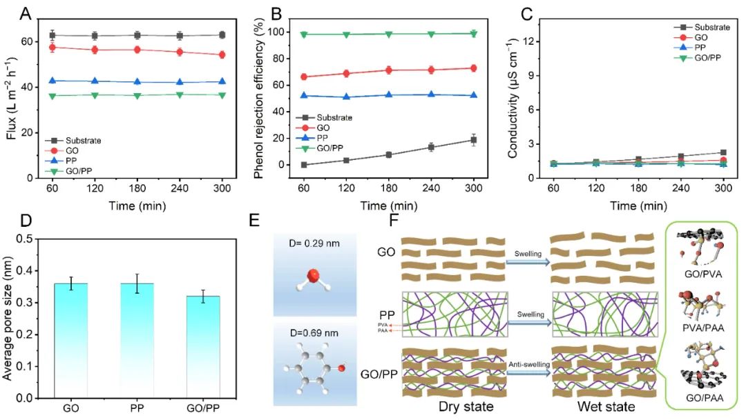 图2 (A-C)对比了膜基底,单组份GO和PP膜以及PP插层GO膜的水通量,苯酚截留率以及出水电导率,(D)GO、PP膜以及GO/PP膜的孔径及(E)PP插层抑制GO膜溶胀示意图