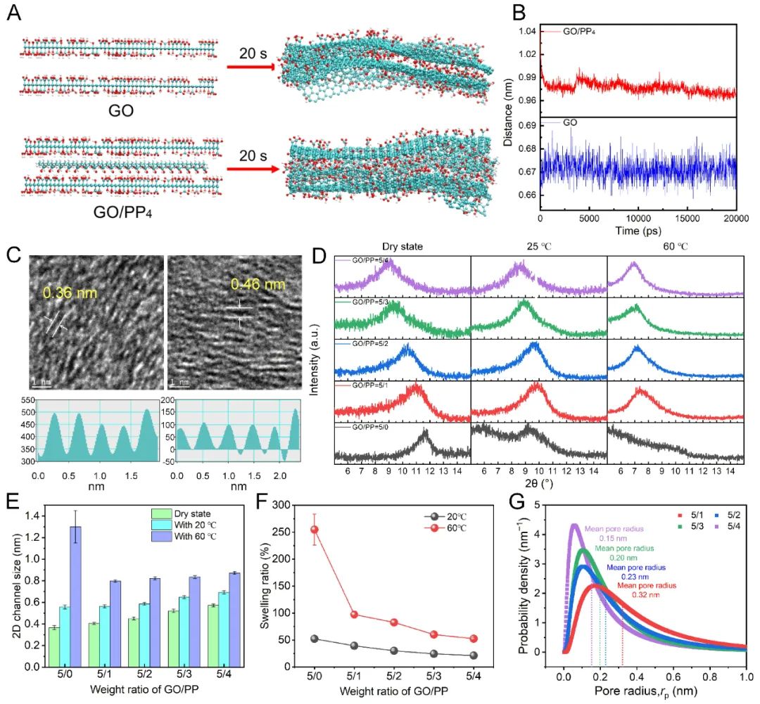 图3 (A)PP插层对GO层间距影响,其中x表示嵌入到GO中的PP对,(B)PP4对石墨烯纳米片质心距离变化影响,(C)GO和GO/PP5/2膜的高分辨率横截面TEM图像,(D)XRD谱图,(E)通道尺寸,(F)不同质量比的GO/PP膜在干燥状态和浸泡在20 ℃和60 ℃状态下的溶胀率,(G)不同质量比GO/PP的孔径分布及平均孔径