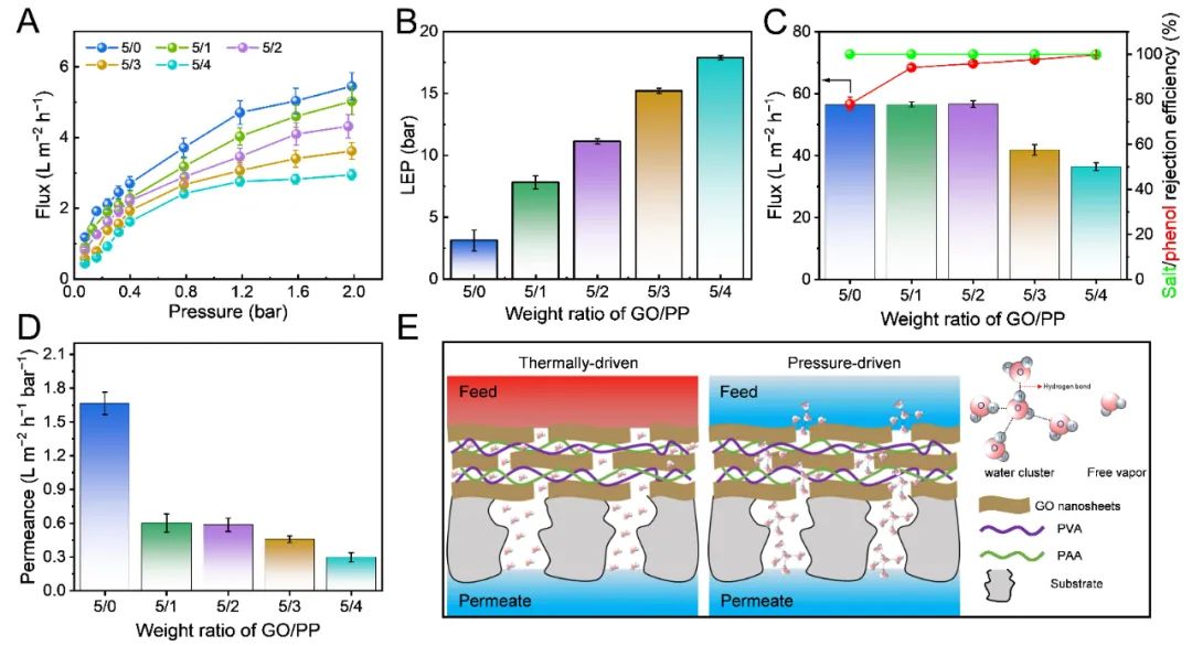 图4 (A)不同GO/PP质量比下N2流量,(B)LEP,(C)蒸汽通量,苯酚和盐的截留效率,(D)不同质量比下GO/PP膜在反渗透过程中的液体渗透率,(E)热驱动MD和压力驱动分离过程渗透机制