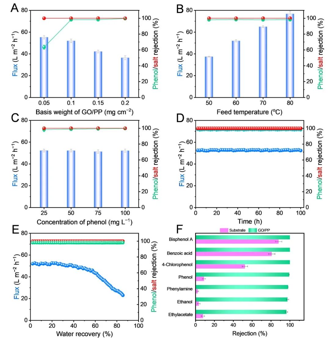 不同克重的GO/PP对膜通量、挥发性苯酚和盐的截留效率的影响。随着GO/PP克重比的增加,GO/PP膜的厚度随之增加,膜水通量从55.31降至36.47 L m−2 h−1。与此同时,苯酚的截留效率从85.74增加到99.58%。值得注意的是,克重为0.10 mg cm−2的GO/PP膜具有约52 L m−2 h−1的高通量和98.17%的苯酚截留效率,该克重下在不显著降低膜通量的情况下实现了更高的挥发性苯酚截留。随后,进一步测试了克重为0.10 mg cm−2的GO/PP膜在不同脱盐条件下的表现。当进料温度从50升高至80 ℃时,GO/PP膜具有较高的苯酚截留效率(>98%),水通量从37.46增加到76.79 L m−2 h−1。此外,挥发性苯酚的截留率不受进料浓度的影响且GO/PP膜在蒸馏和浓缩高盐废水时均具有优异的截留率。最为重要的是,相比于基膜,GO/PP膜对不同尺寸大小的挥发性物质均具有优异的截留率。