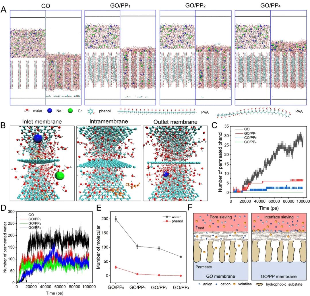 图6 (A)不同质量比下GO膜和GO/PP膜的初始和终态渗透模型,(B)水通过GO/PP4膜扩散,同时苯酚和盐被GO/PP4膜截留模拟图,(C-E)不同质量比下通过GO/PP膜的酚和水分子数,(F)GO和GO/PP膜中离子和挥发物的筛分机制示意图