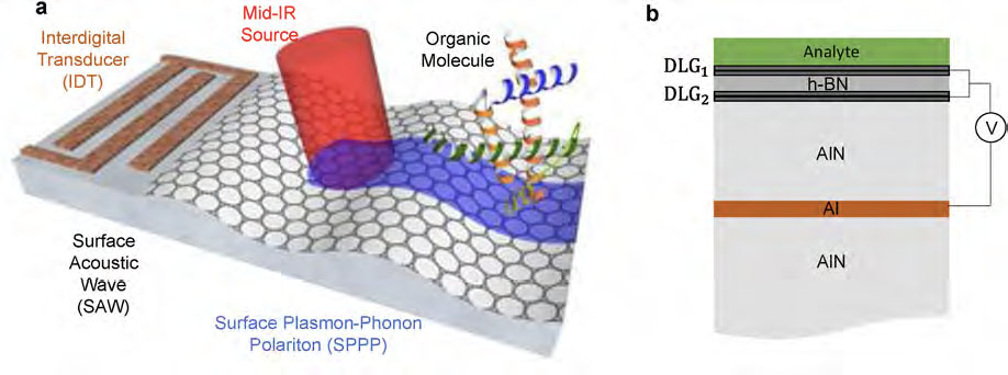 通过用电门控调节双石墨烯层的费米能级,他们定制了混合石墨烯等离子体-六方氮化硼声子模式,以在与常见生物键振动相关的红外频率上共振。然后,他们激活集成表面声波装置,产生纳米级声波,使石墨烯堆栈动态“产生波纹”。这种虚拟衍射光栅将传播的石墨烯极化子与目标频率的红外光耦合,而不需要永久的纳米结构。