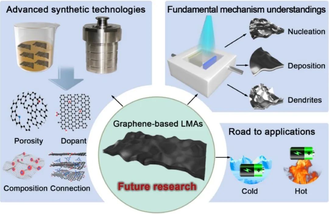 通过对石墨烯基主体材料进行结构工程设计、杂原子掺杂以及与其他活性材料复合,可以有效提升锂金属电池的循环性能。然而,锂金属电池的商业化过程仍面临一些挑战。例如,非活性物质会增加电池的重量,也容易在主体材料内部产生空腔。因此,提高锂/碳比、增加正极负载量、使用贫电解液、降低N/P比等策略对于优化锂金属电池性能至关重要。后续研究应重点关注以下几个方面:1)先进的制备方法,以实现对主体材料孔结构和缺陷密度等的精确调控;2)深入的机理研究,包括对锂的初始成核过程研究,更深入地了解石墨烯基主体材料的锂枝晶生长机制以及抑制策略;3)实用化探索,例如低成本、大规模制备石墨烯基材料、解决浆料制备复杂问题,以及在极端条件下(高温、大倍率)保持循环稳定性和解决电池安全问题等。