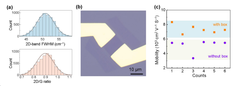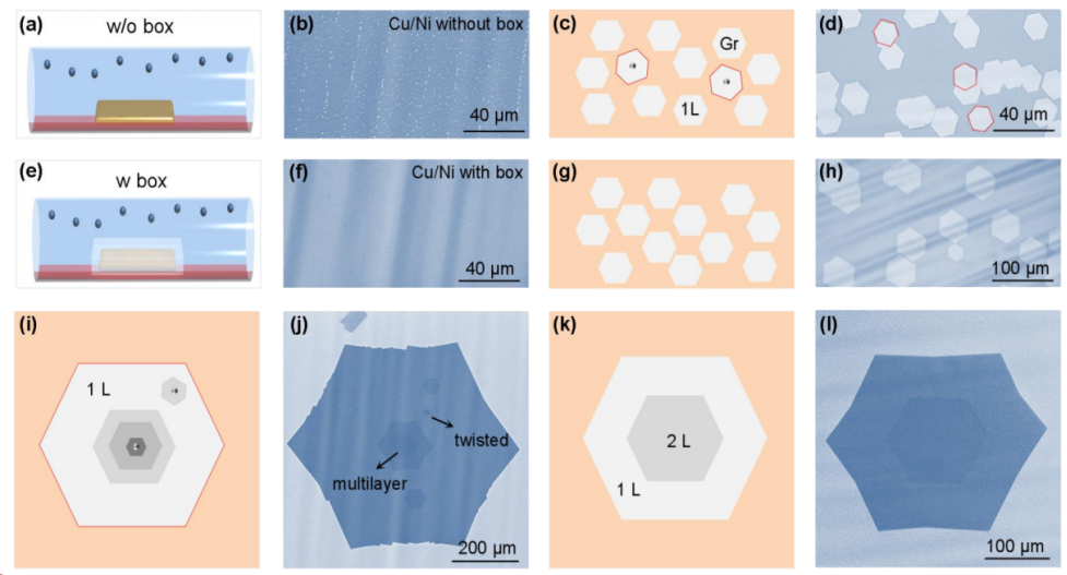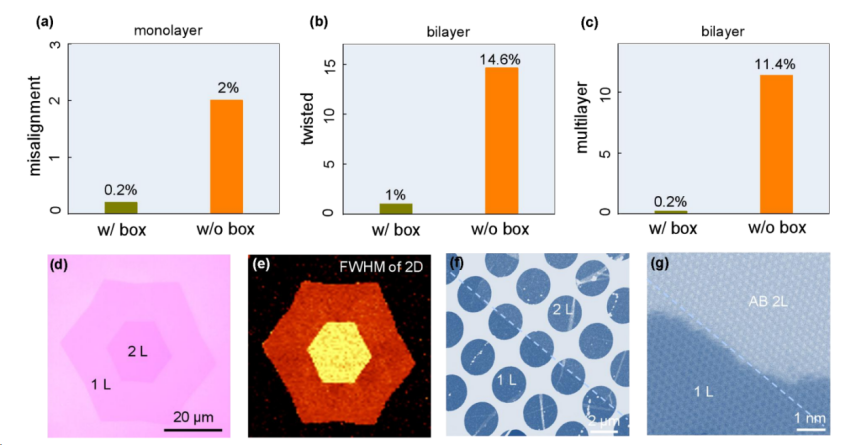 未使用盒子生长的单层石墨烯的错误取向百分比约为2%,而采用盒子生长后,此比例降至0.2%,减少了约10倍。对于双层石墨烯的生长,扭曲双层石墨烯和多层的比例用传统方法生长中分别为14.6%和11.4%,在使用盒子时降至1%和0.2%。