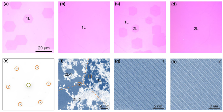 通过增加生长时间,可以连续获得排列整齐的单层石墨烯晶畴、单层石墨烯单晶膜、双层石墨烯晶畴和双层石墨烯单晶薄膜。低能电子衍射表征验证了大面积的堆叠顺序和晶格取向。透射电镜在合并区域验证了双层石墨烯晶畴的无缝拼接。
