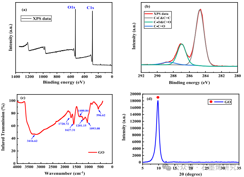 图2. 氧化石墨烯的表征:(a)总光谱,(b) C1s光谱,(c) FTIR光谱,(d) XRD光谱。