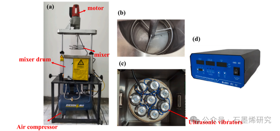 图3. (a)超声辅助混合装置(b)混合器内部布局,(c)超声混合鼓底部,(d)超声波发生器。