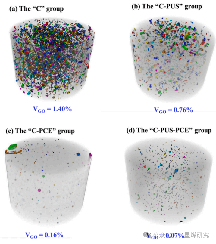 图5. 不同样品水泥浆体中氧化石墨烯的空间分布:(a)“C”组,(b)“C-PUS”组,(C)“C-PCE”组,(d)“CPCE-PUS”组。所有氧化石墨烯颗粒均以RGB颜色渲染。