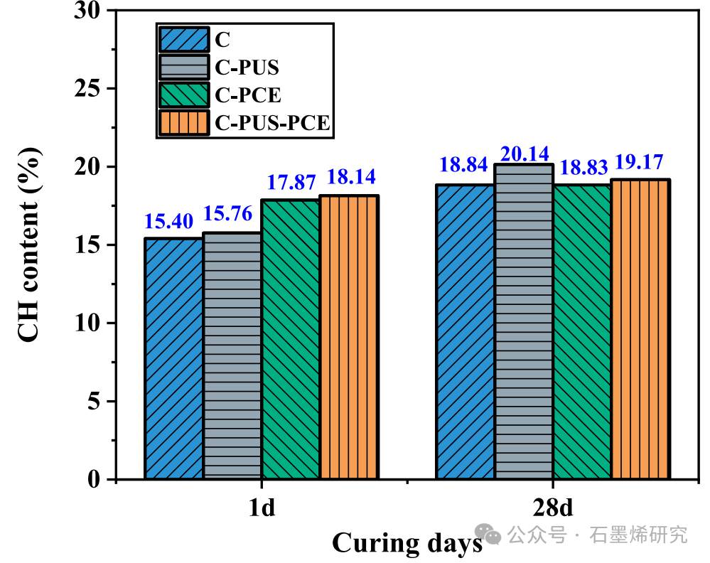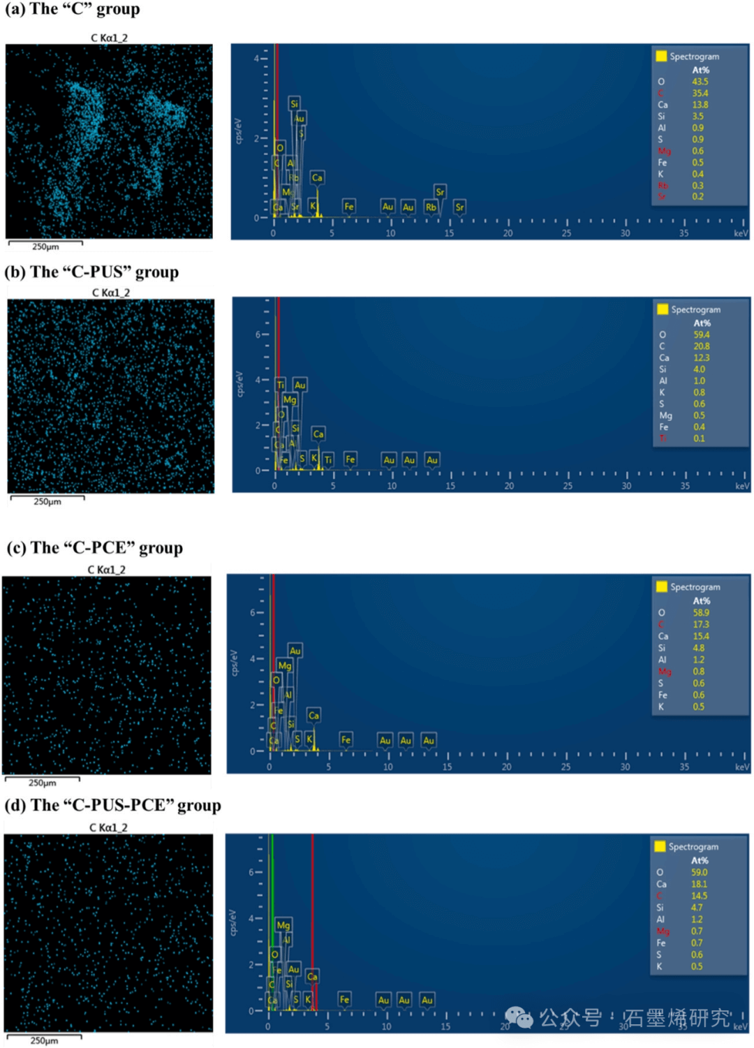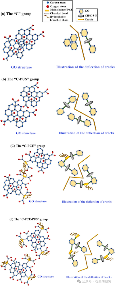 图16. 氧化石墨烯对不同基团的增强效果示意图。(a)“C”组,(b)“C-PUS”组,(C)“C-PCE”组,(d)“C-PCE-PUS”组。