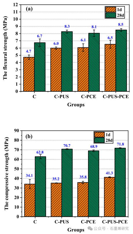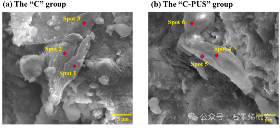 图8. 固化28天后氧化石墨烯的微观结构:(a)“C”组,(b)“C-PUS”组。