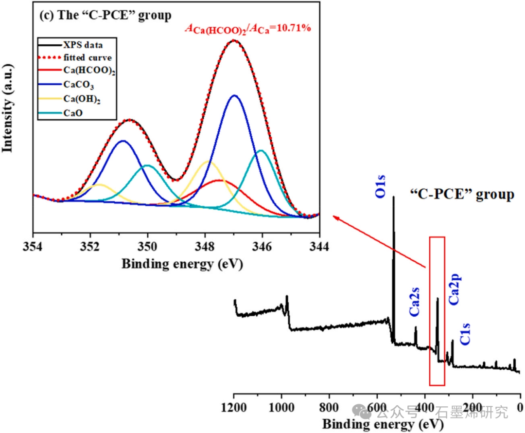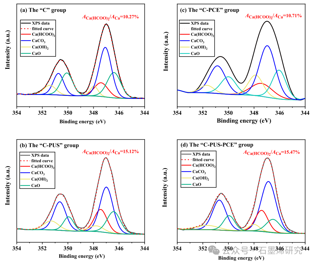 图7. 不同样品水泥浆中氧化石墨烯的C原子能谱图结果:(a)“C”基团,(b)“C-PCE”基团,(C)“C-PUS”基团,以及(d)“C-PCE-PUS”组。