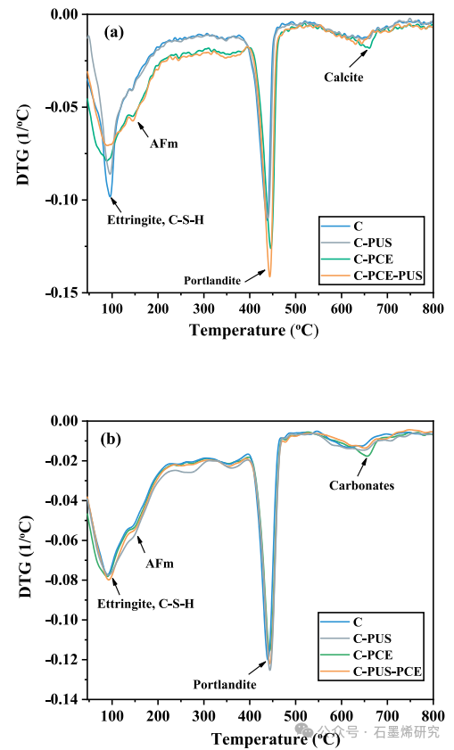 11. 各样品的DTG曲线示意图:(a) 1天,(b) 28天。
