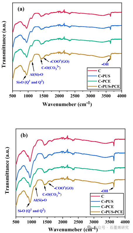 图13. 氧化石墨烯改性水泥的FTIR光谱:(a)1天,(b)28天。