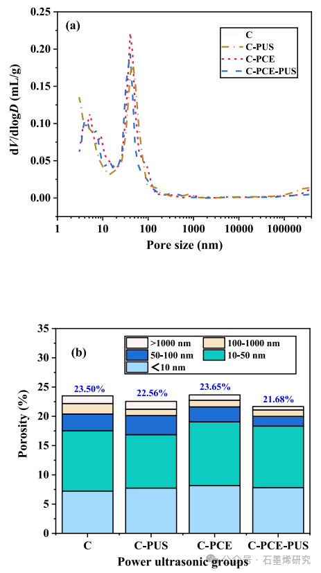 图14. 不同样品在28d时的孔隙结构。(a)差异孔径曲线,(b)孔隙率。