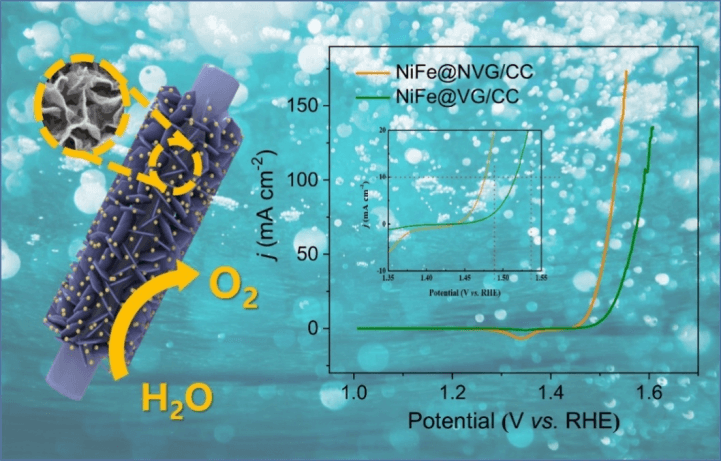 近日,张永起教授课题组成功合成了NiFe@NVG/CC并将其作为碱性水的高效OER电催化剂。在1 M KOH中,NiFe@NVG/CC在10 mA·cm-2下的过电位(η10)仅为245 mV,Tafel斜率低至36.2 mV·dec-1,并且具有出色的电解耐受性。此外,通过密度泛函理论计算阐明了镍铁与NVG之间的协同效应,这种效应增强了对*OOH的吸附能力。