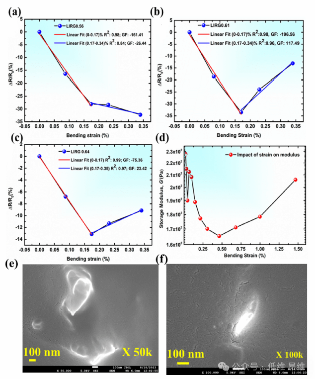 图2 (a–c) 不同组成制备的弯曲应变灵敏度。(d) 样品的储存模量相对变化随不同应变的函数(LIRG 0.61)。LIRG 0.61的SEM显微图在(e) 50 000和(f) 100 000倍放大率下。