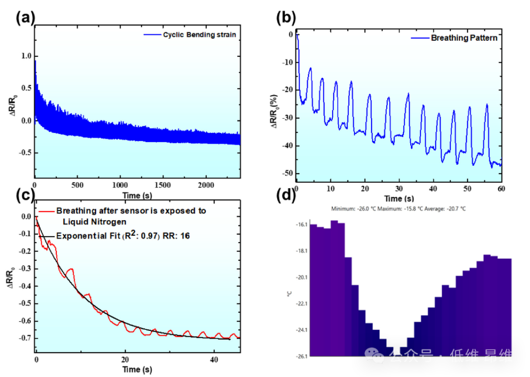 为了进一步验证传感器在低温环境下的性能,研究者进行了模型实验,并使用液态氮对传感器进行冷却。结果显示,即使在零下条件下,冷却后的传感器仍能有效地解读呼吸模式。此外,研究者使用热红外摄像机分析了传感器的温度,发现其最低温度达到-26°C。这表明开发的传感器具有在低温条件下监测呼吸轮廓的能力,这对于军事和国防应用中的高海拔和低温环境下监测低氧和确定其他呼吸参数具有重要意义(c-d)。