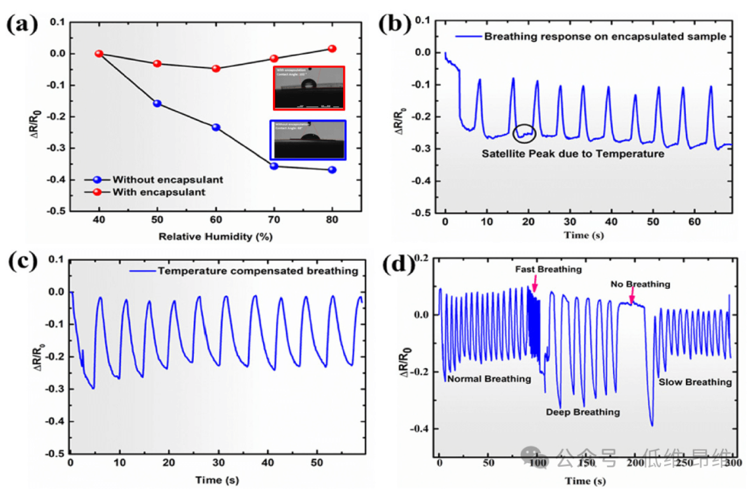 图4 (a) 非封装和封装样品中相对湿度变化对相对电阻的响应的比较。插图显示了封装(红色插图,接触角为102°)和非封装样品(蓝色插图,接触角为68°)的接触角测量,(b) 带封装剂的传感器对呼吸的响应,(c) 在封装样品上的温度补偿呼吸信号和(d) 作为相对电阻变化函数的正常、快速、深呼吸、无呼吸和慢呼吸的呼吸信号。图5 应用封装剂和小麦斯通桥之后(a)和(b)之前获得的扩展呼吸信号。