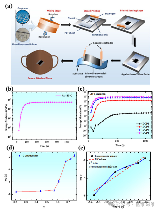 图1 (a) 传感器制备的示意图。第一步涉及使用以旋转后革命为原则的行星离心混合器混合所需配方(液态聚异戊二烯橡胶、过氧化二异丙苯和石墨烯),以开发无气泡墨水。然后利用刮板在聚对苯二甲酸乙二醇酯上模板印刷开发的墨水。印刷的传感器然后被干燥,电极被施加。因此,传感器被连接到口罩上。对开发的传感器样品进行流变学研究。(b) 固化温度对传感器组分的储存模量的影响(Y轴上的对数刻度)。(c) 不同DCP装载量对185°C固化的储存模量的影响(Y轴上的对数刻度),(d) 不同组分的对数电导率作为不同填充物体积分数的函数,以及(e) 对获得的电导率进行幂律模型拟合。