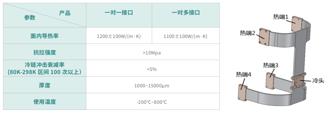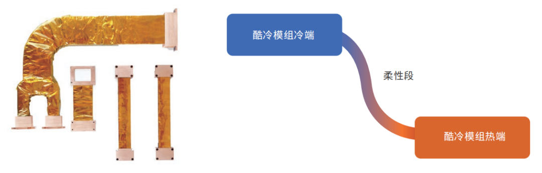 组件由一个酷冷模组热端对应一个酷冷模组冷端(也可以制定单个酷冷模组热端对应多个酷冷模组冷端或者多个酷冷模组热端对应单个酷冷模组冷端),两者之间通过高柔性的石墨烯导热膜段链接。