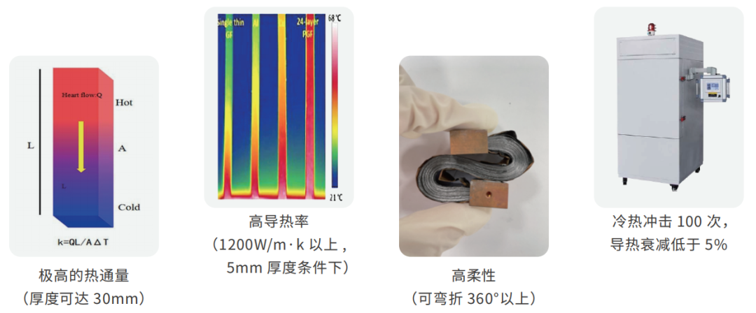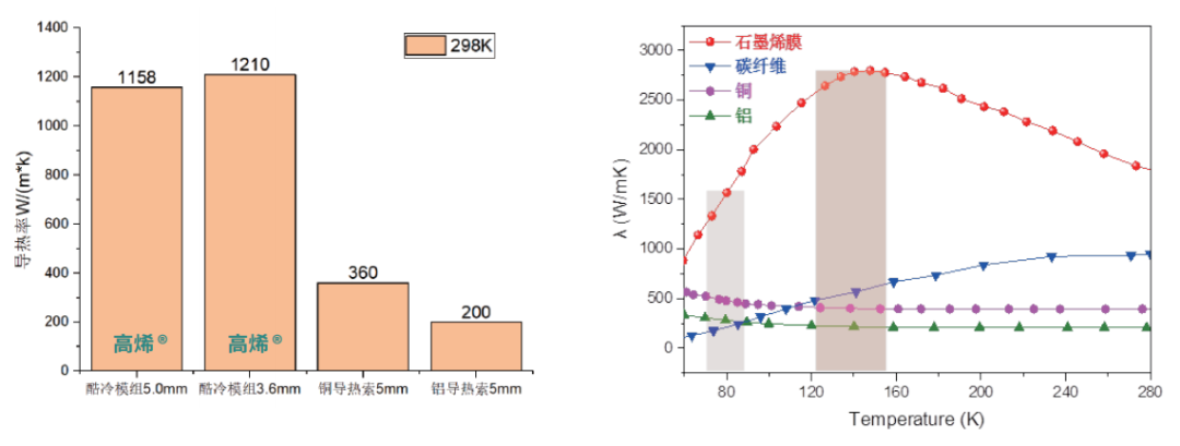 在常温条件下, 高烯®高通量酷冷模组拥有相较于铜导热索3-4倍、铝导热索5倍的导热率。这意味着,在相同形状条件下,高烯石墨烯高通量酷冷模组不仅质量约为铜导热索的四分之一,而且导热效果较铜导热索更好3倍,另外减震效果较铜铝金属的导热索更好。