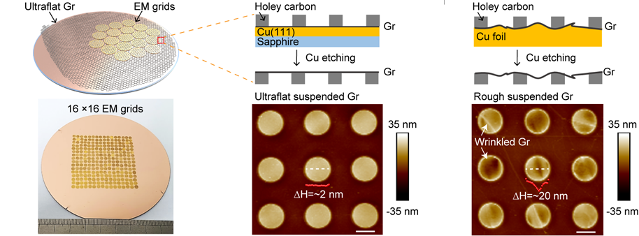 此外,BGI利用4英寸石墨烯晶圆生长出粗糙度低、均一性好、褶皱较少的单晶石墨烯薄膜,转移至冷冻透射电镜载网上,可形成新型超平整石墨烯载网。这种载网的解析质量更高,目前已经应用于多种小蛋白解析,例如streptavidin(链霉亲和素蛋白,52kDa)、hemoglobin(血红蛋白,64kDa)和α-fetoprotein(甲胎蛋白,67kDa),分别实现2.2A、3.5A和2.6A的高分辨率结构重构。