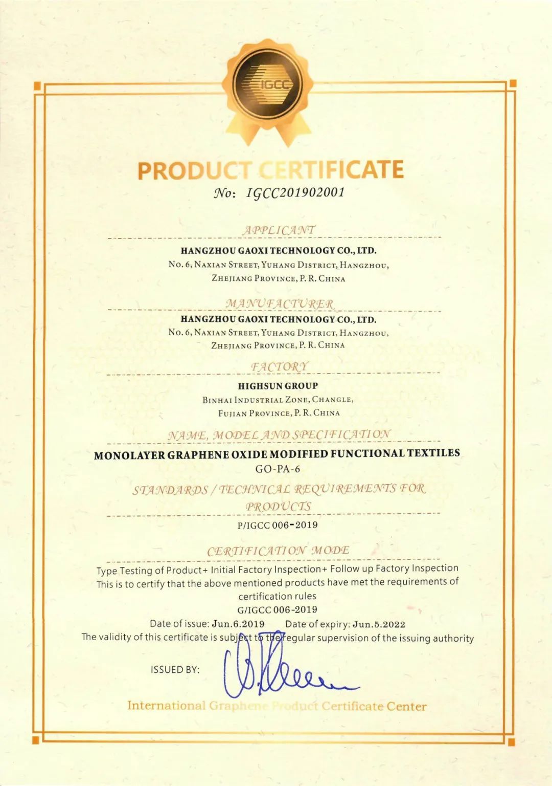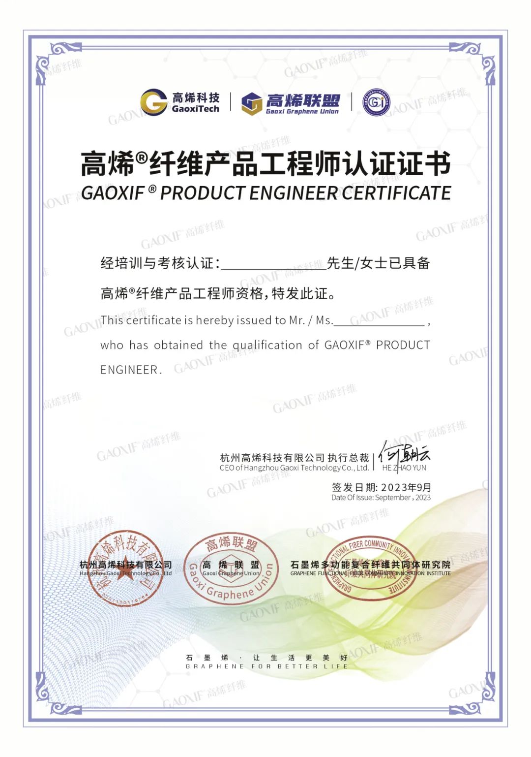 杭州高烯科技有限公司、高烯联盟、石墨烯复合纤维共同体研究院为所有完成系统学习,通过考核的学员签发了高烯®纤维产品工程师认证证书。