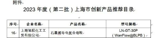 2023年岁末,上海市公布《2023年度(第二批)上海市创新产品推荐目录》(以下简称《推荐目录》),利物盛集团全资子公司上海驰程化工工贸有限公司(以下简称上海驰程)创新产品“石墨烯导电复合母粒”成功入选,这是《推荐目录》中唯一一项导电复合材料产品。