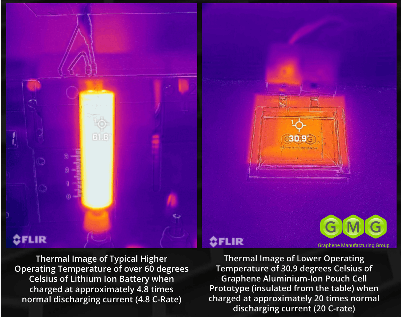 该公司很高兴地宣布,已发现 GMG 石墨烯铝离子电池充电和放电时的温升极小。当以高 C 倍率多次充电和放电时会观察到这一点(C 倍率测量电池可以充电或放电的电流,例如,1 C 倍率电池应能够在 1 小时内完全放电)。如图1所示,世界领先品牌生产的高品质锂离子电池在允许的最大电流(4.8 C倍率 – 估计0.8 A/g)放电时,温度可超过60摄氏度。正极活性材料质量)。相比之下,当 GMG 的石墨烯铝离子电池以更高的电流密度(20 C 倍率 – 阴极活性物质约为 2.0 A/g)放电时,温度为 29 摄氏度。两种电池的温度都是在 23.5 摄氏度(+/- 0.5 摄氏度)的室温下测得的。