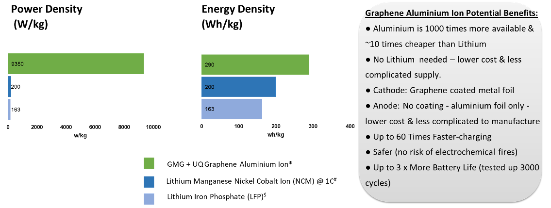 与最常用的锂离子电池相比,GMG 的下一代石墨烯铝离子电池性能数据(在纽扣电池上进行测试和计算)如下图 5 所示,并列出了其有益特性。