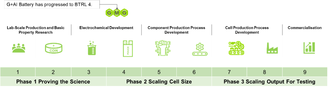 石墨烯铝离子技术的电池技术就绪级别(“BTRL”)保持在 4 级(见图 4)。 GMG 目前正在通过正在进行的实验室实验来优化软包电池的电化学行为。当 GMG 试运行其试验工厂时,预计该公司的电池技术将进步到 BTRL 7 和 8,因为制造石墨烯铝离子电池的设备和工艺与制造锂离子电池的设备和工艺相同。