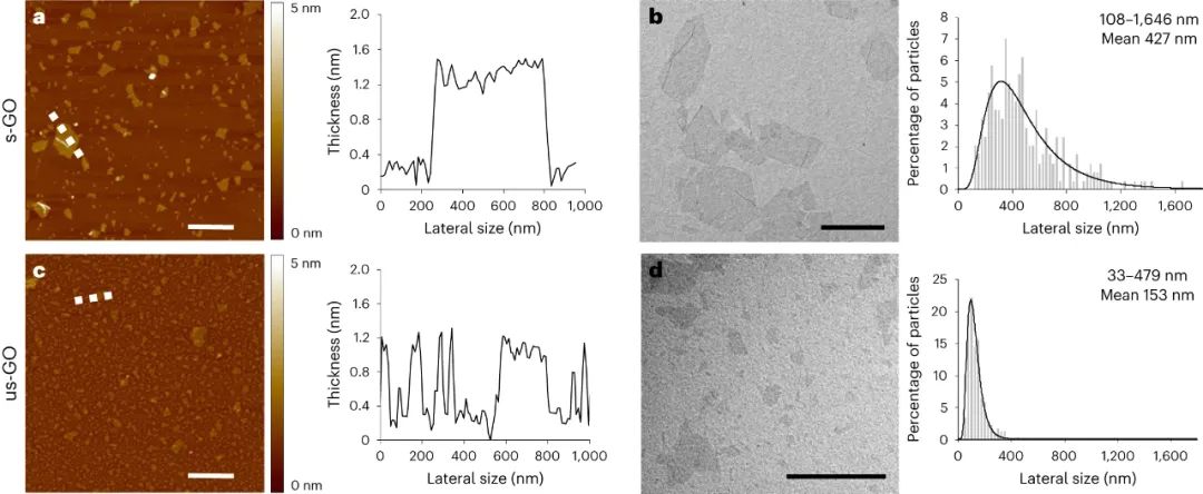 研究人员采用改进的Hummers方法合成了薄的、高纯度的无金属和无内毒素GO材料,并对其进行了全面表征。GO纳米片具有严格限定的尺寸,没有金属或其他元素污染、残留物或细菌污染的迹象。选择两个横向维度(保持所有其他物理化学特征几乎相同)进行研究:小GO(s-GO)和超小GO(us-GO)。
