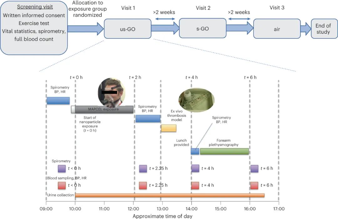 本研究遵循了《赫尔辛基宣言》,并在爱丁堡大学以及相关的英国国家卫生服务研究与发展办公室进行了严格的伦理审查。志愿者在精心控制的条件下,通过间歇性骑行吸入GO或过滤空气2小时。在14名参与者中,有13人完成了所有3次访问。所有暴露都得到了良好的耐受性,参与者报告称没有与暴露相关的症状,仅有轻度短暂疲劳与锻炼有关。在每个研究日内均未报告任何症状,整个研究期间也未出现任何临床不良事件。高纯度GO急性吸入没有明显影响的结果突显了在人体中进行石墨烯基纳米材料的控制性暴露用于风险评估的可行性。