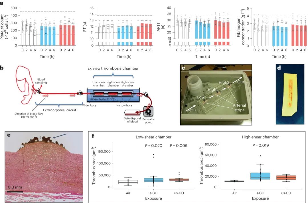 研究引入了动脉血栓形成的体外模型,考虑了血液与血管壁的相互作用。在低剪切力室中,吸入s-GO或us-GO均导致血液的较大血栓形成能力,而在高剪切力室中,仅s-GO暴露组表现出这种效应。这表明传统的凝血标志物是对血栓形成能力的粗略指标,应考虑受损血管壁等生理条件。尽管暴露后血液的血栓形成能力较之前略有增加,但这种影响的程度相对较轻,即使是已有心脏病的患者,后果也可能有限。因此,建议在开发对石墨烯材料进行风险评估的实验模型中包括血栓形成潜能的表征,尤其是对可能存在较高风险的石墨烯材料,或考虑更高的暴露情景。