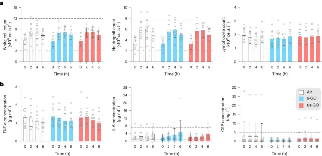参与者通过呼吸面罩吸入气溶胶化的GO纳米片,目标质量浓度为200 μg/m³。在2小时的暴露期间,s-GO和us-GO的实际浓度分别为214±23 μg/m³和224±17μg/m³,并且保持在恒定水平。预期地,相同质量下,us-GO的粒子数比s-GO更多。