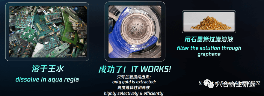 现在我们身边有很多电子废物,电子废物中有许多重要原材料,比如金、银、钴、镍等。大家都想从电子设备中提取,并回收原材料,但很难。然而石墨烯,为我们提供了一种可能性。